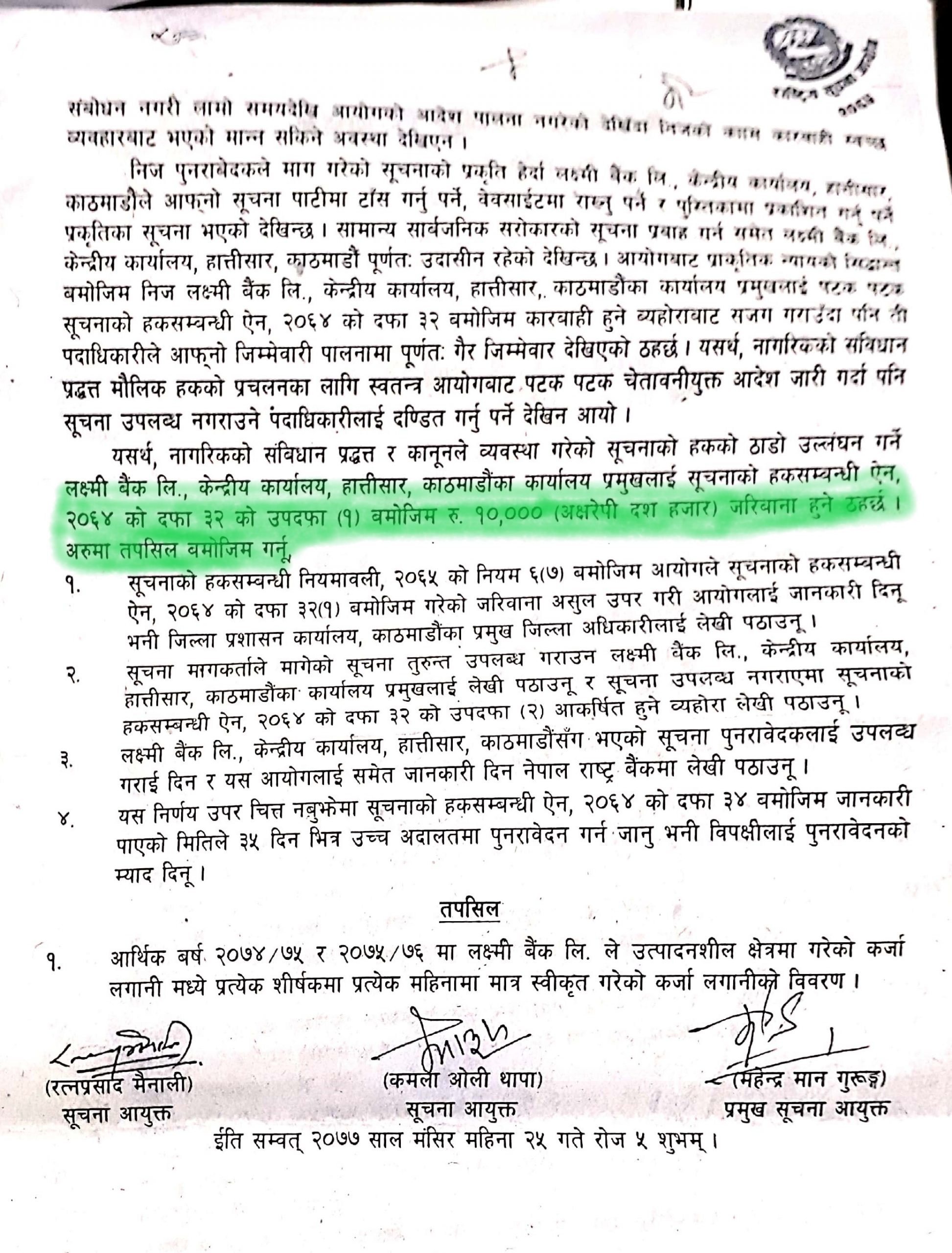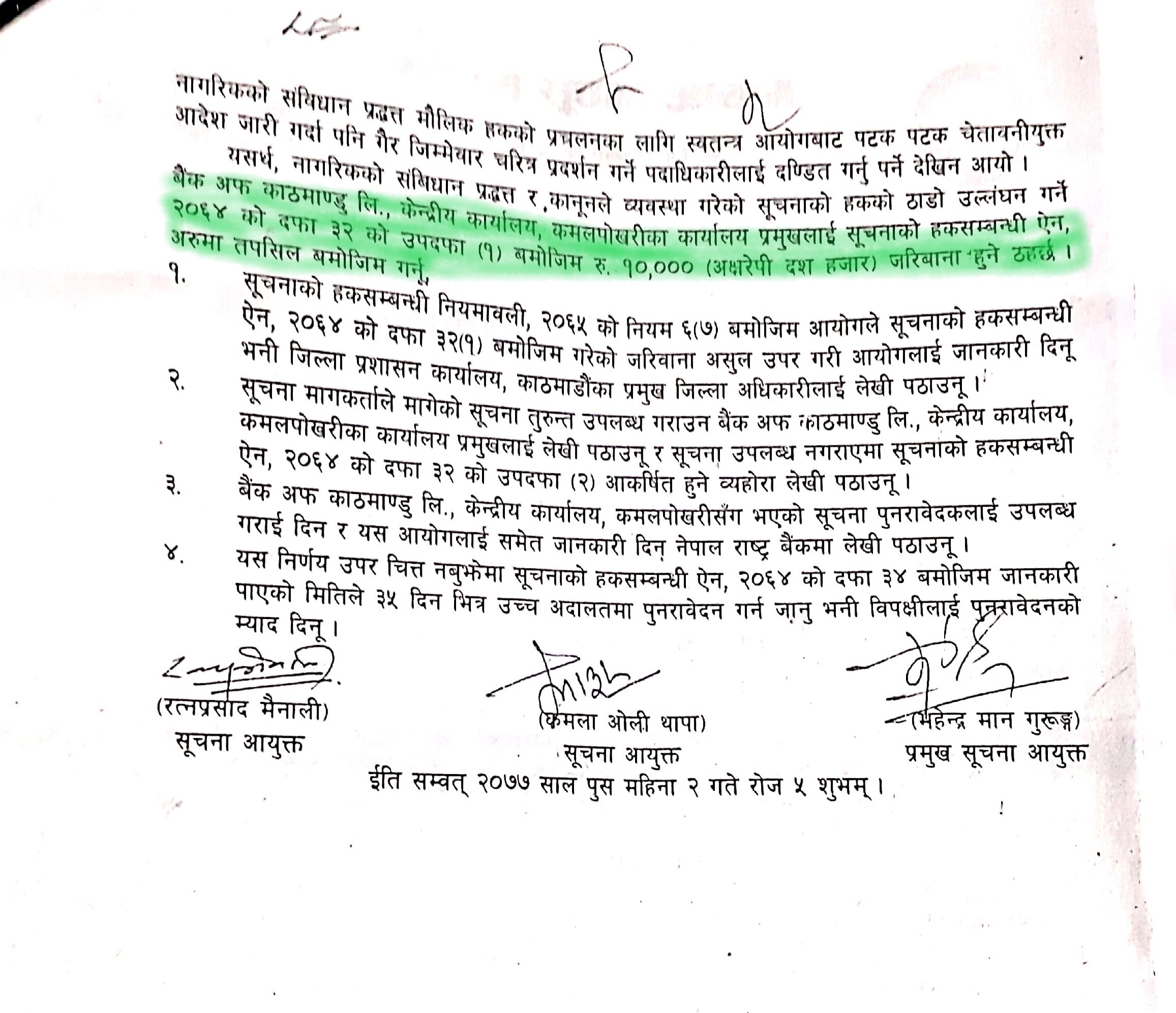 सूचनाको हक सम्बन्धी ऐन अनुसार आफुले मागेको सूचना बैंकका सूचना अधिकारी तथा कार्यालय प्रमुखबाट नपाएपछि जुम्ला जिल्ला चन्दननाथ नगरपालिका वडा नम्बर ४ का स्थायी बासिन्दा अंगराज भारतीले राष्ट्रिय सूचना आयोग समक्ष पुनरावेदन दर्ता गराउनु भएको थियो । उक्त पुनरावेदनउपर छलफल गर्दै प्रमुख सूचना आयुक्त महेन्द्र मान गुरुङ्ग, सूचना आयुक्त कमला ओली थापा र सूचना आयुक्त रत्नप्रसाद मैनालीको संयुक्त इजलासले तीनवटै बैंकका कार्यालय प्रमुख (प्रमुख कार्यकारी अधिकृत) लाई १० हजार रुपैंयाँका दरले जरिवाना तोकेको हो । यहि मंसिर २५ र पुस २ गतेको इजलासले तीनवटै बैंकका सिइओबाट जरिवाना असुल उपर गरी आयोगलाई जानकारी दिनु भनि जिल्ला प्रशासन कार्यालय काठमाडौंलाई आदेश दिएको छ ।