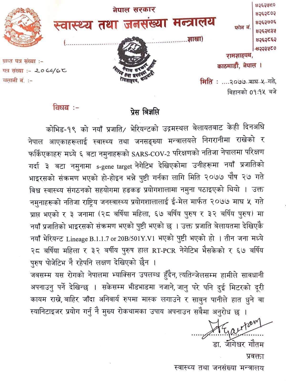 पुस पहिलो साता बेलायतबाट आएका तीन जनामा देखिएको संक्रमण नयाँ प्रकारको कोरोना भाइरस (भेरियन्ट लाइनएज बी १.१.७) भएको पाइएको छ । बेलायतबाट नेपाल आएका ६ जनामा १३ पुसमा कोरोना संक्रमण भएको पुष्टि भएको थियो । तर जिन सिक्वेन्सिङ नभएका कारण नयाँ प्रकार भए नभएको खुलेको थिएन ।