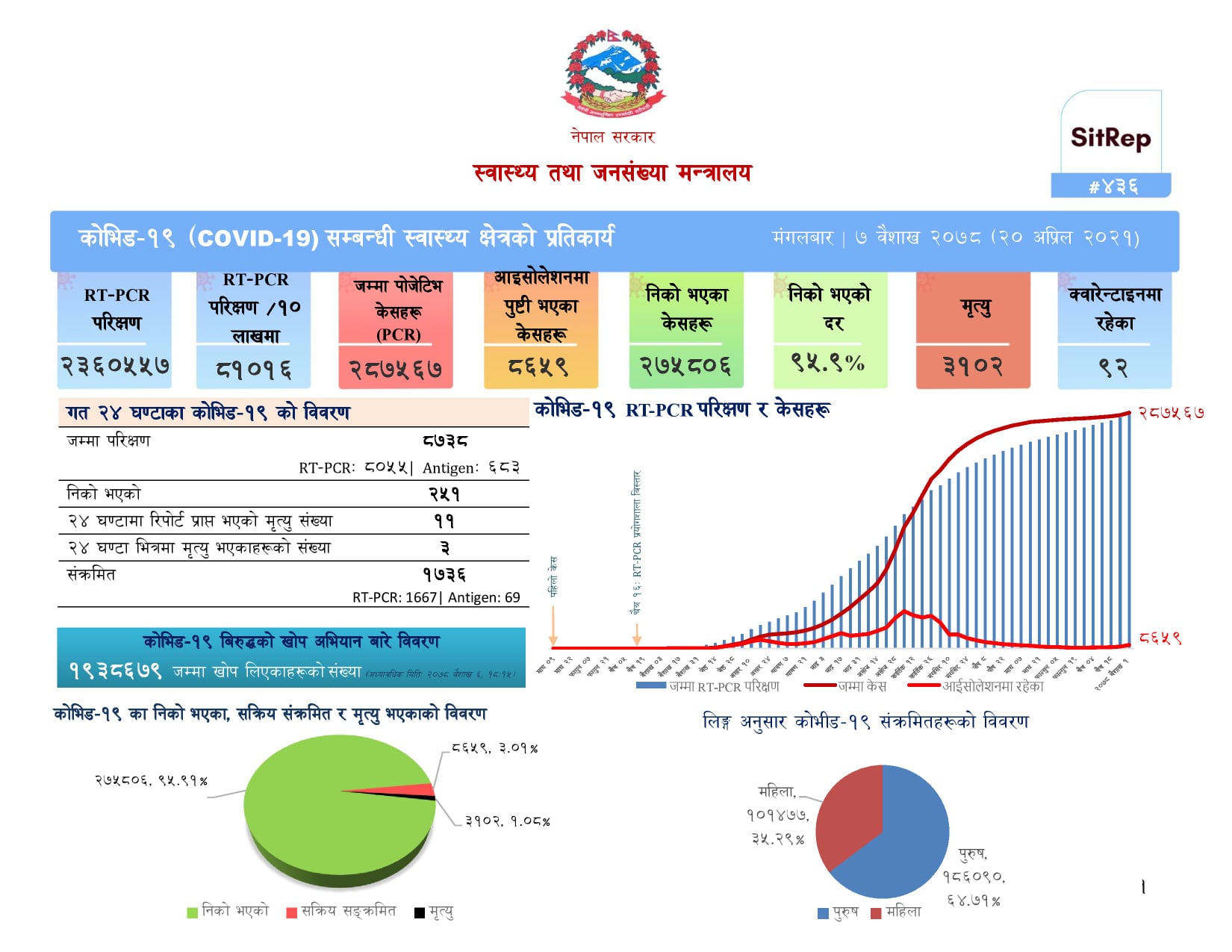 यो सँगै निको हुनेको संख्या २ लाख ७५ हजार ८ सय ६ पुगेको छ । सक्रिय संक्रमित ८ हजार ६ सय ५९ छन् भने क्वारेन्टाइनमा ९२ जना रहेका छन् । ९८ प्रतिशतसम्म निको हुने दर रहेकोमा अहिले घटेर ९५ दशमलव ९ प्रतिशतमा झरेको छ । नेपालमा आजसम्म कोरोनाबाट मृत्यु हुनेको संख्या ३ हजार १ सय २ रहेको छ ।