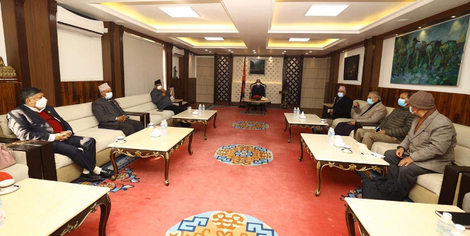 प्रधानमन्त्री निवास बालुवाटारमा मंगलबार अपरान्ह साढे ४ बजेबाट गठबन्धनको बैठक जारी रहेको छ ।