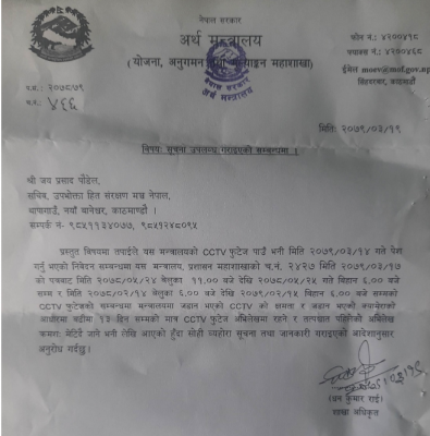 उपभोक्ता हित संरक्षण मञ्चका तर्फबाट जयप्रसाद पाैडेलले जेठ १४ गते रातिको सीसीटीभी फुटेज उपलब्ध गराई सूचनाको हक प्रदान गर्न निवेदन दिएको थियो । सो निवेदनको जवाफ दिँदै अर्थ मन्त्रालय योजना, अनुगमन तथा मूल्यांकन महाशाखाले भनेको छ ‘मन्त्रालयमा जडान भएको सीसीटीभीको क्षमता र जडान भएको क्यामेराको आधारमा बढीमा १३ दिनसम्मको मात्रै सीसीटीभी फुटेज अभिलेखमा रहने र तत्पश्चत पहिलेको अभिलेख क्रमश: मेटिँदै जाने भनी लेखी आएको हुँदा सोही ब्यहोरा सूचना तथा जानकारी गराइएको आदेशानुसार अनुरोध गर्दछु ।’