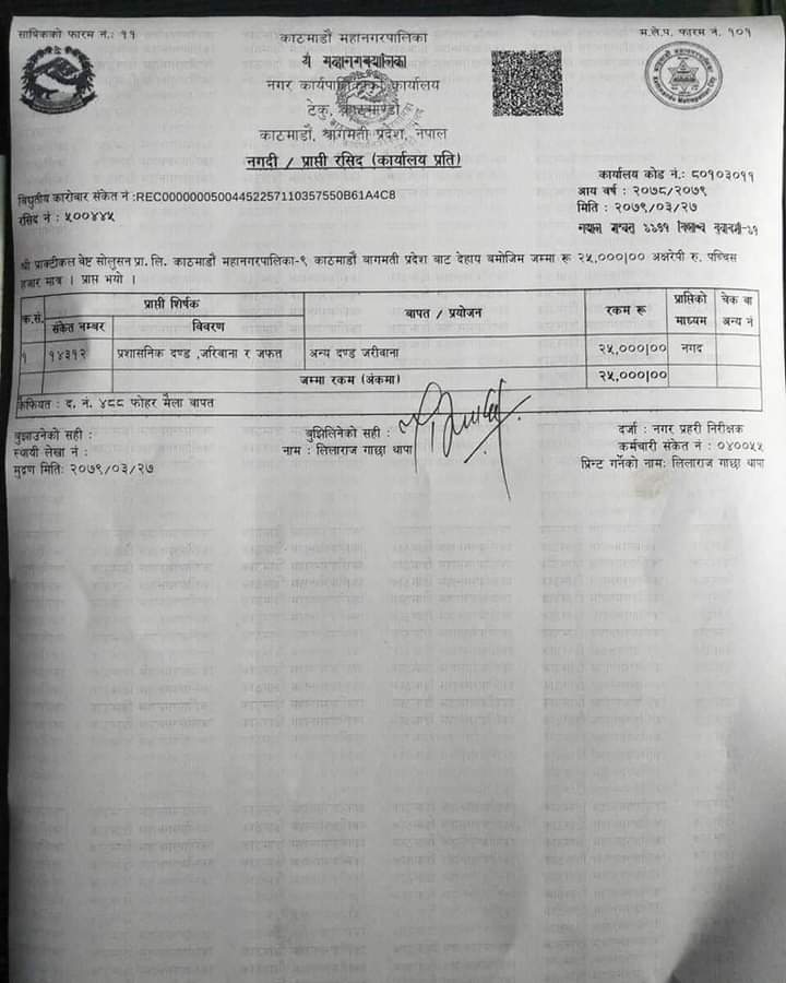 प्राक्टिकल बे‍स्ट सोलुसन प्रालिलाई महानगरले २५ हजार रुपैयाँ जरिवाना तिराएको मेयर बालेन शाहले फेसबुक मार्फत जानकारी ‍दिएका छन्।