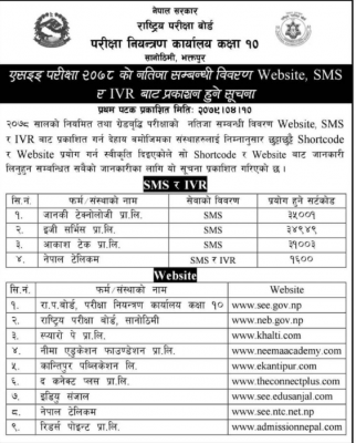 एसईईको नतिजा राष्ट्रिय परीक्षा बोर्ड, राष्ट्रिय परीक्षा बोर्ड परीक्षा नियन्त्रण कार्यलय कक्षा १०, नेपाल टेलिकम लगायतको वेबसाइटमा गएर हेर्न सकिने छ । यस्तै Result लेखेर एक स्पेस दिइ आफ्नो सिम्बोल नम्बर राखेर ३५००१ मा एसएमएस गरेर पनि नतिजा थाहा पाउन सकिने बोर्डले जनाएको छ ।