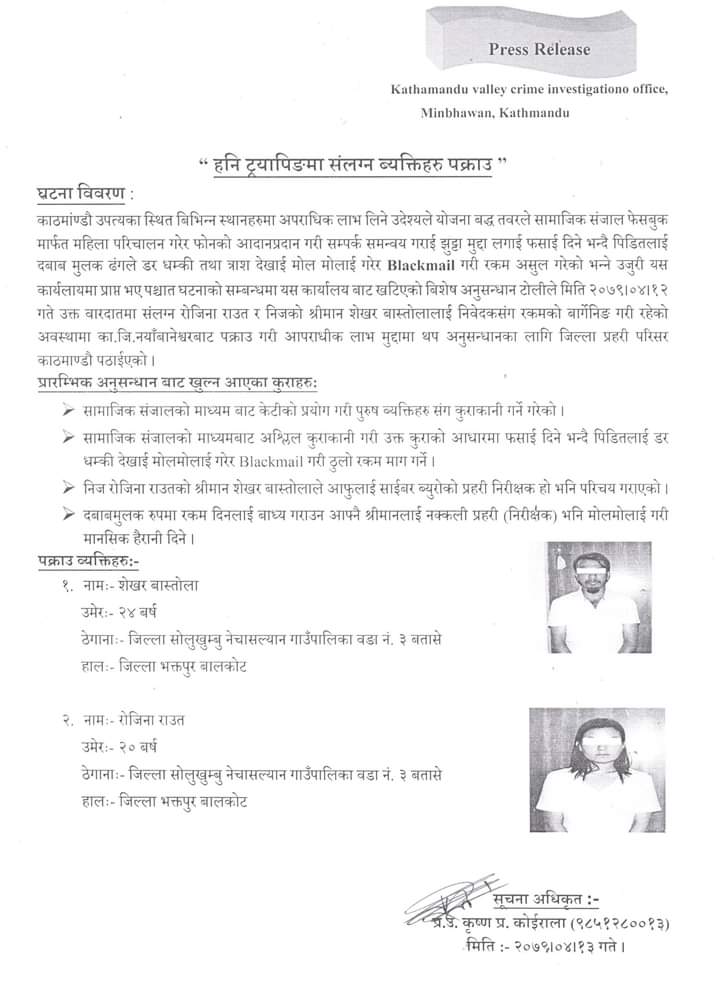 काठमाडौं – प्रहरीले विभिन्न व्यक्तिलाई हनी ट्रयापिङमा पारेर मोलमलाई गरेको अभियोगमा दुई जनालाई पक्राउ गरेको छ ।