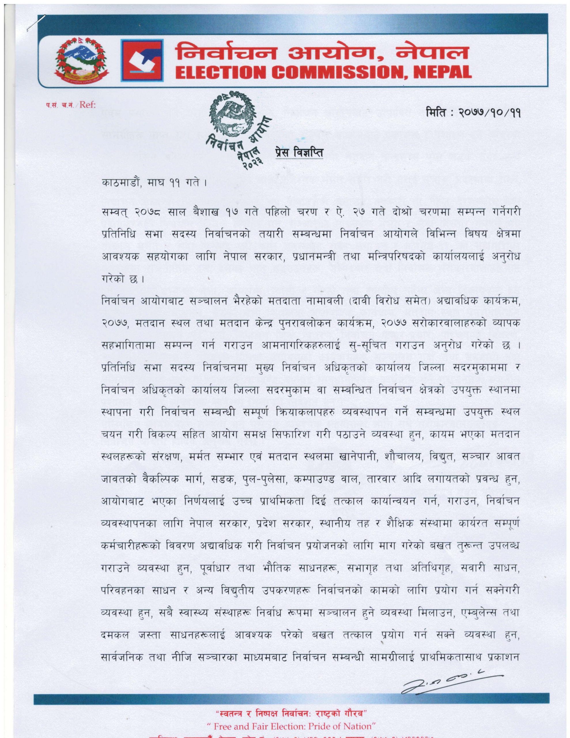 निर्वाचन आयोगले आगामी बैशाख १७ र २७ गतेका लागि घोषणा भएको प्रतिनिधिसभा निर्वाचनको तयारीका लागि आवश्यक सहयोग गर्न सरकारलाई अनुरोध गरेको छ । आयोगको आजको निर्णय अनुसार मतदाता नामावली अद्यावधिक कार्यक्रम, मतदानस्थल तथा मतदान केन्द्र पुनरावलोकन कार्यक्रम सरोकारवालाको व्यापक सहभागितामा सम्पन्न गर्न गराउन आम नागरिकहरुलाई सुसूचित गराउन नेपाल सरकार प्रधानमन्त्री तथा मन्त्रिपरिषदको कार्यालयलाई अनुरोध गरेको छ ।