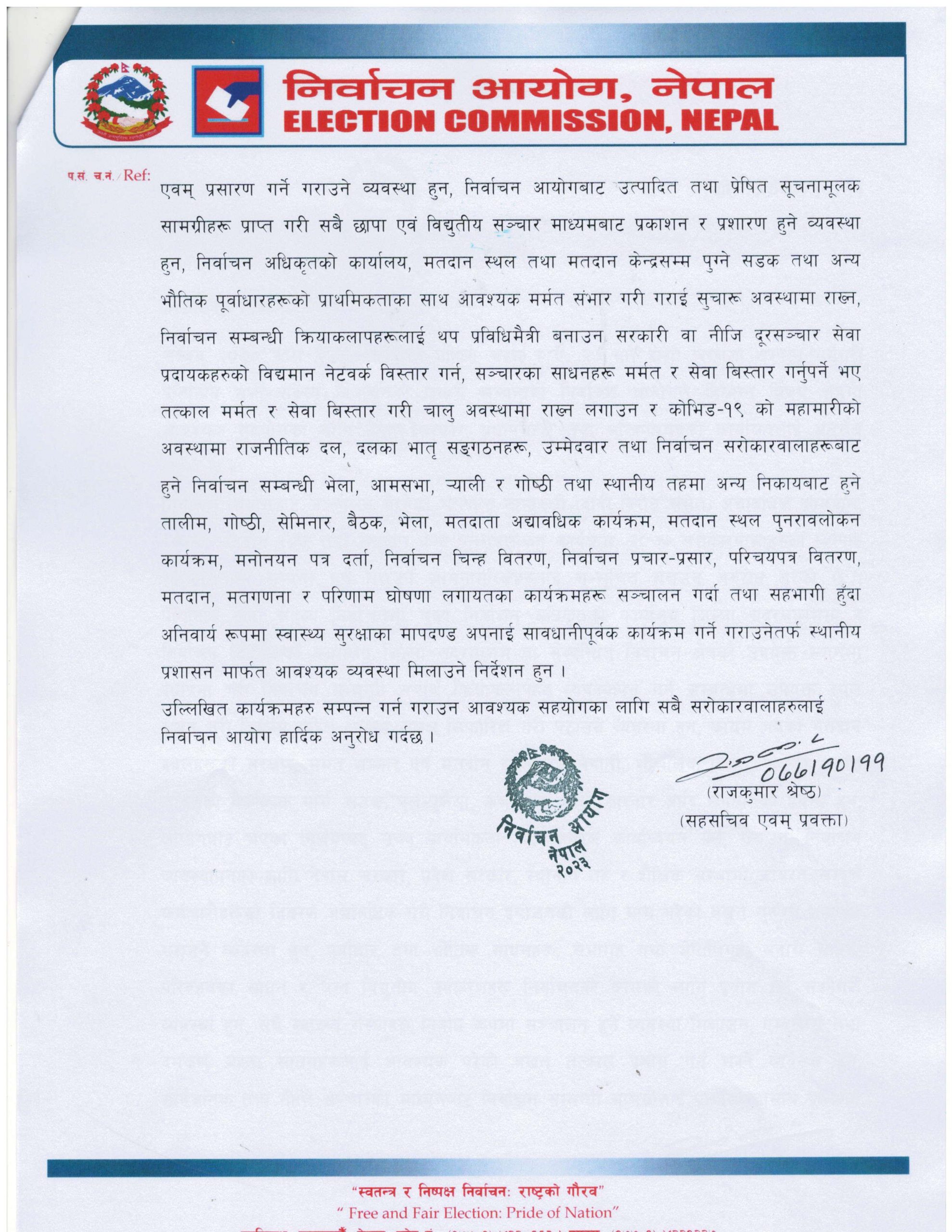 आयोगबाट भएका निर्णयलाई उच्च प्राथमिकता दिई तत्काल कार्यान्वयन गर्न, गराउन, निर्वाचन व्यवस्थापनका लागि नेपाल सरकार, प्रदेश सरकार, स्थानीय तह र शैक्षिक संस्थामा कार्यरत सम्पूर्ण कर्मचारीहरुको विवरण अद्याबधिक गरी निर्वाचन प्रयोजनका लागि माग गरिएको बखत तुरुन्त उपलब्ध गराउन पनि आयोगले अनुरोध गरेको उहाँको भनाई छ ।