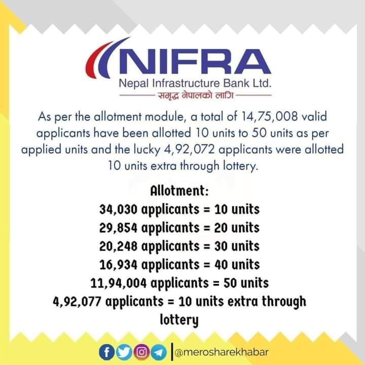 नेपाली सेयर बजारको इतिहासकै सबैभन्दा ठूलो परिमाणमा निष्काशन गरिएको नेपाल इन्फ्रास्ट्रक्चर बैंक (निफ्रा) को आईपीओ शुक्रबार बाँडफाँट गरिएको हो । योग्य आवेदकमध्ये ४ लाख ९२ हजार ७७ जनाले ६० कित्ताका दरले सेयर हात पारेका छन् ।