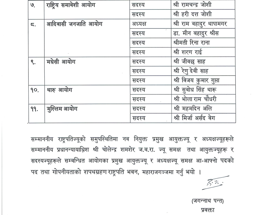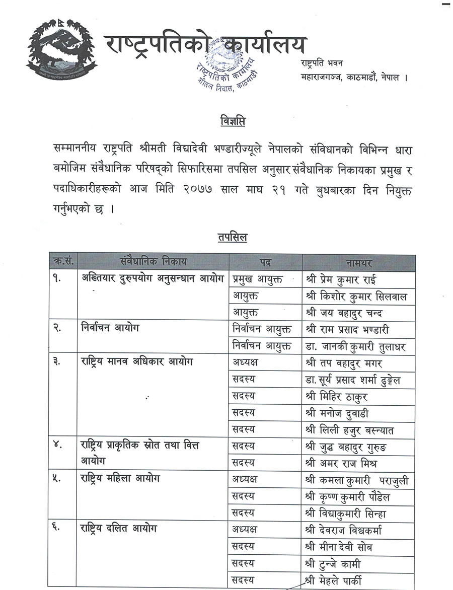 यस्तै निर्वाचन आयोगको आयुक्तमा रामप्रसाद भण्डारी र डा. जनकुमारी तुलाधर नियुक्त हुनु भएको छ । राष्ट्रिय मानवअधिकार आयोगको अध्यक्षमा तपबहादुर मगर र सदस्यहरुमा सूर्यप्रसाद शर्मा ढुंगेल, मिहिर ठाकुर, मनोज दुवाडी र लीली हजुर बस्न्यात नियुक्त भएको राष्ट्रपति कार्यालयले जनाएको छ ।