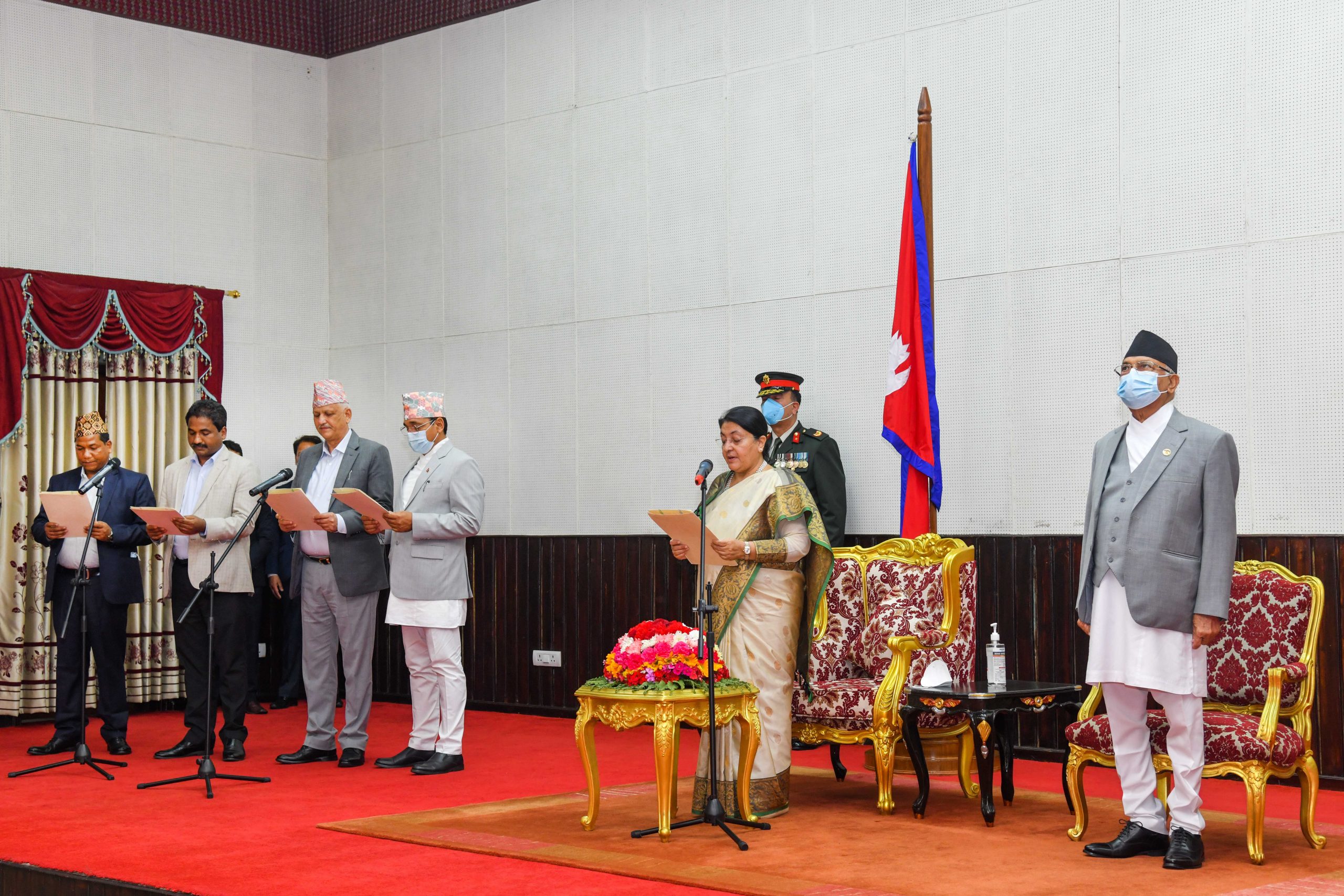 पुनर्नियुक्ति पाएका ४ मन्त्रीले शुक्रबार साँझ पद तथा गोपनीयताको शपथ लिएका छन् । ऊर्जा, जलस्रोत तथा सिञ्चाईमन्त्री टोपबहादुर रायमाझी, उद्योग वाणिज्य तथा आपूर्तिमन्त्री लेखराज भट्ट, शहरी विकास मन्त्री प्रभु साह र श्रम, रोजगार तथा सामाजिक सुरक्षामन्त्री गौरीशंकर चौधरीलाई शुक्रबार साँझ राष्ट्रपति विद्यादेवी भण्डारीले शपथ गराउनु भएको हो ।