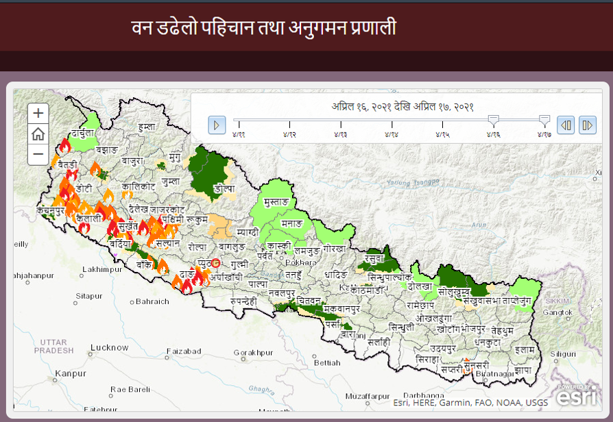 वन तथा भू–संरक्षण विभागको ‘वन डढेलो पहिचान तथा अनुगमन प्रणाली’ले बिहीबार मुलुकको पश्चिम भागमा मात्र डढेलो लागेको देखाएको छ । लामो खडेरीका कारण चैत दोस्रो सातापछि देशभर डढेलो विकराल बनेको थियो । एकै दिन ५ सय स्थान सम्म डढेलो लागेको थियो । डढेलोमा परेर धन, जन र जैविक विविधतामा व्यापक क्षतिभएको छ । सरकारले क्षतिको आँकलन गरिसकेको छैन ।