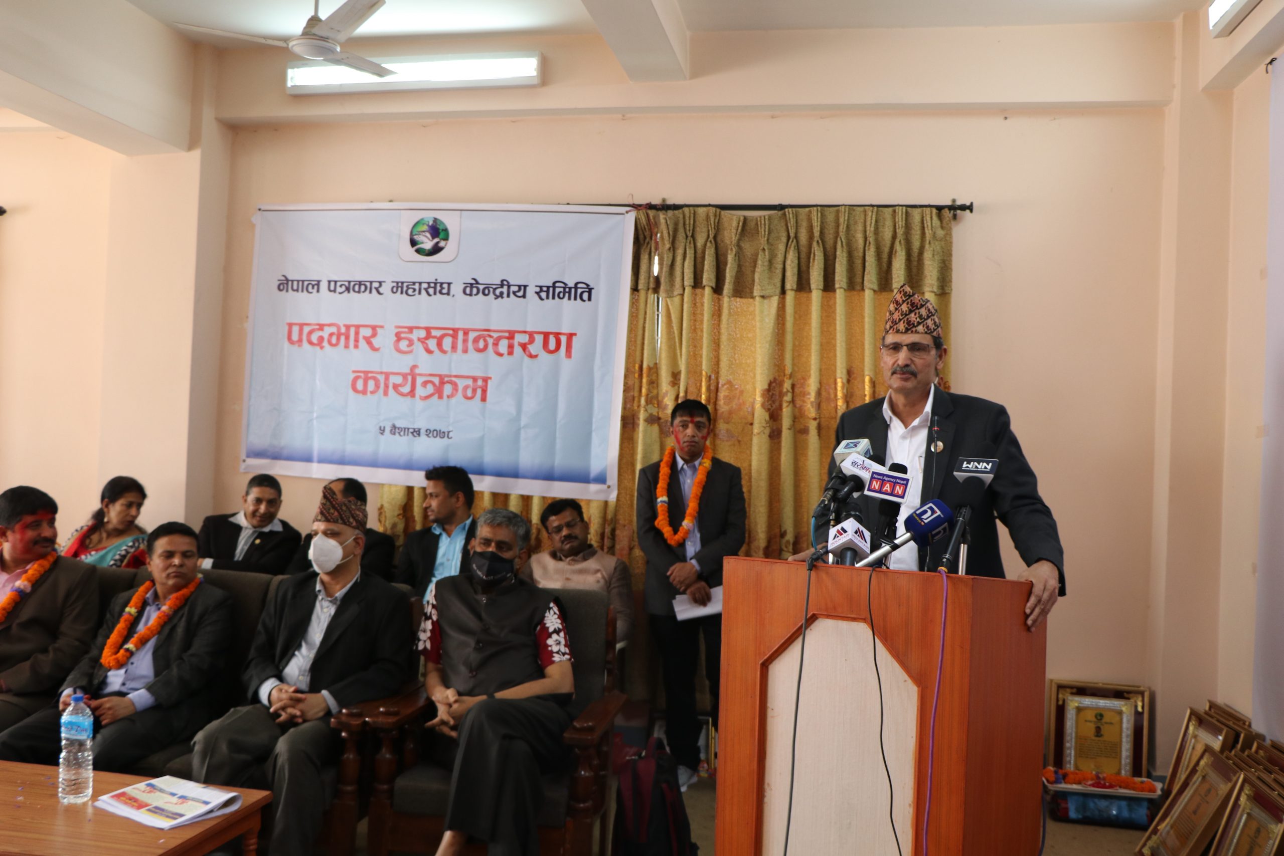 यसैबीच, नेपाल पत्रकार महासंघको २६ औं महाधिबेशनबाट निर्वाचित नयाँ कार्यसमितिलाई पदभार हस्तान्तरण गरिएको छ । आइतबार नेपाल पत्रकार महासंघमा भएको समारोहका प्रमुख अतिथि सभामुख अग्निप्रसाद सापकोटाले नेपाल पत्रकार महासंघका नवनिर्वाचित पदाधिकारी र सदस्यहरुलाई कार्यसफलताको शुभकामना दिनुभयो ।