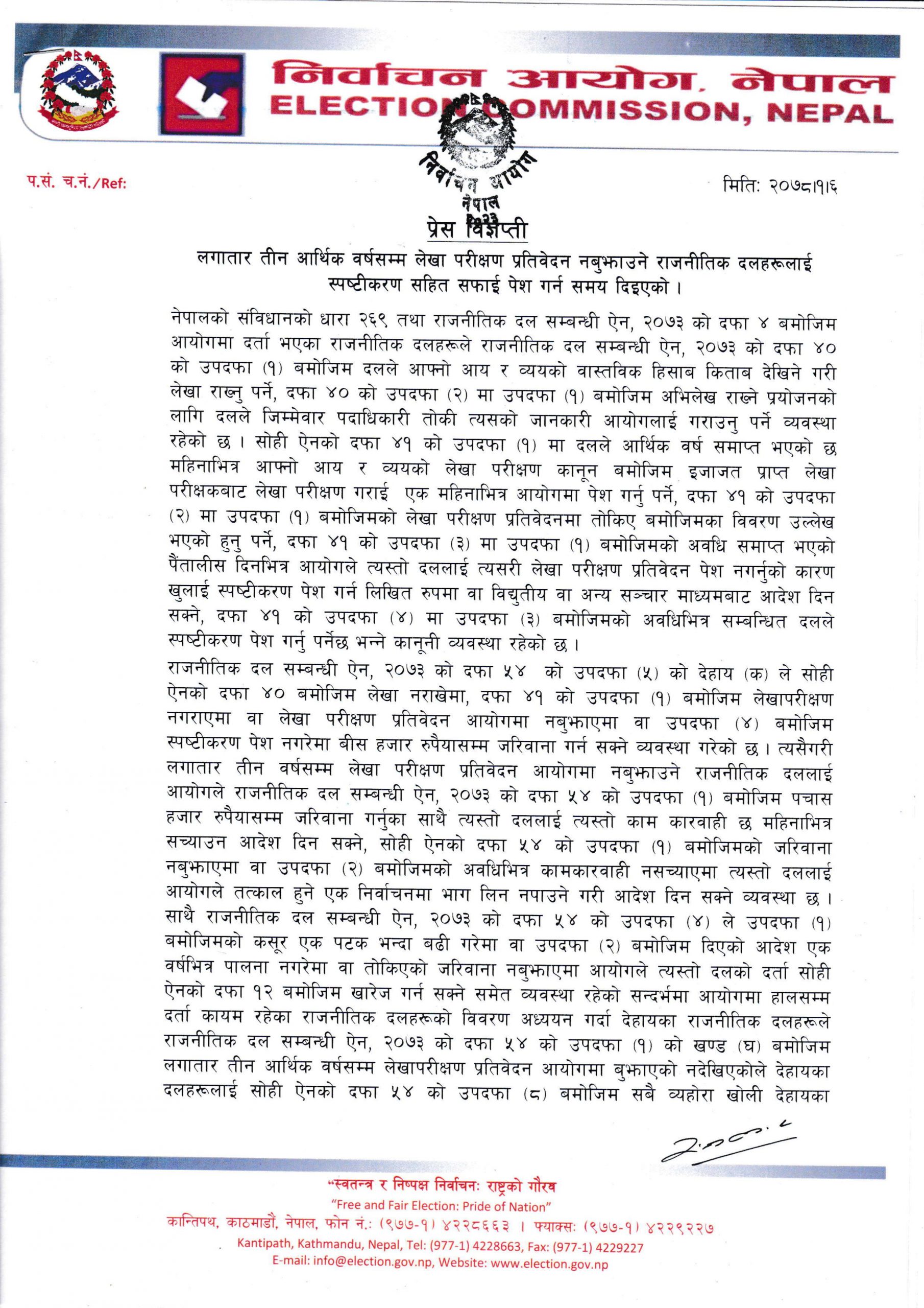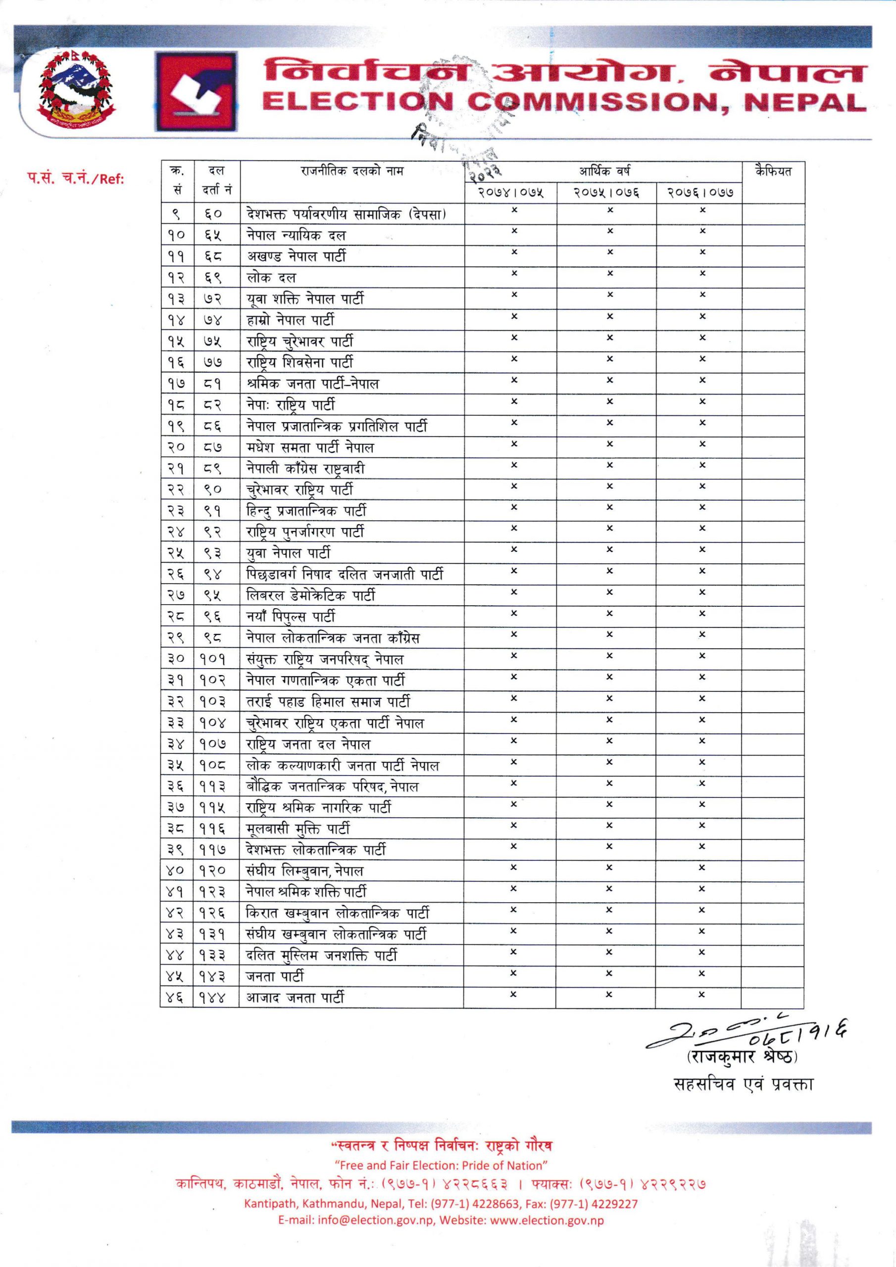 ऐनको उक्त प्रावधानअनुसार लगातार तीन आर्थिक वर्षसम्म लेखापरीक्षण प्रतिवेदन आयोगमा बुझाएको नदेखिएका विभिन्न ४६ दलहरूलाई आयोगले औचित्यपूर्ण र चित्तबुझ्दो कारणसहित स्पष्टीकरण सहितको सफाइ पेश गर्न समय दिने गरी निर्णय गरेको सहसचिव एवं प्रवक्ता राजकुमार श्रेष्ठद्वारा जारी विज्ञप्तिमा उल्लेख छ ।