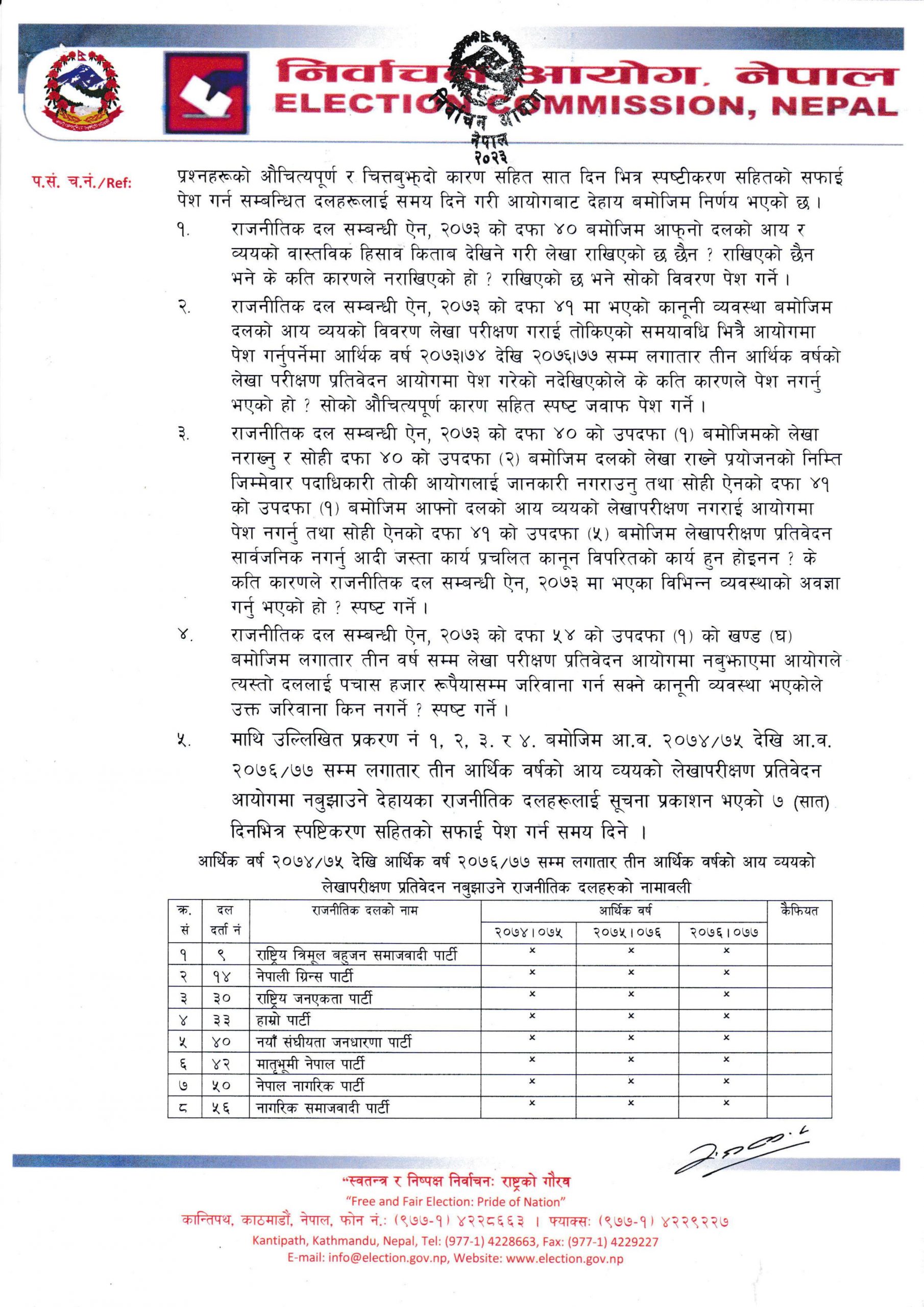 आयोगले दलहरुलाई आय र व्ययको वास्तविक हिसाब किताब देखिने गरी लेखा राखिएको छ छैन ? राखिएको छैन भने के कति कारणले नराखिएको हो भन्ने प्रश्न गरेको छ । यस्तै आयोगले कानूनी व्यवस्था बमोजिम दलको आय व्ययको विवरण लेखापरीक्षण गराई तोकिएको समयावधि भित्रै आयोगमा पेश गर्नुपर्नेमा लगातार तीन आर्थिक वर्षको लेखापरीक्षण प्रतिवेदन आयोगमा पेश गरेको नदेखिएकाले के कति कारणले पेश नगर्नु भएको हो त्यसको सोको औचित्यपूर्ण कारण खोजेको छ ।