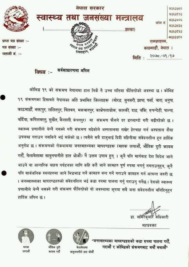 मन्त्रालयले आज जारी गरेको अपिलमा स्वास्थ्य प्रणालीले थेग्नै नसक्ने गरी सङ्क्रमण बढेकाले अस्पताल शैया उपलब्ध गराउन नसकिने भइसकेको उल्लेख गरेको छ । अपिलमार्फत मन्त्रालयले सबैलाई संवेदनशील हुन र स्वास्थ्य मापदण्ड पालना गर्न आग्रह गरेको छ । सङ्क्रमण रोकथाममा जनस्वास्थ्यका मापदण्डहरु (मास्क लगाऔँ, भौतिक दुरी कायम गरौं, बेलाबेलामा साबुनपानीले हात धोऔँ) नै उत्तम उपाय भएको अपिलमा भनिएको छ ।