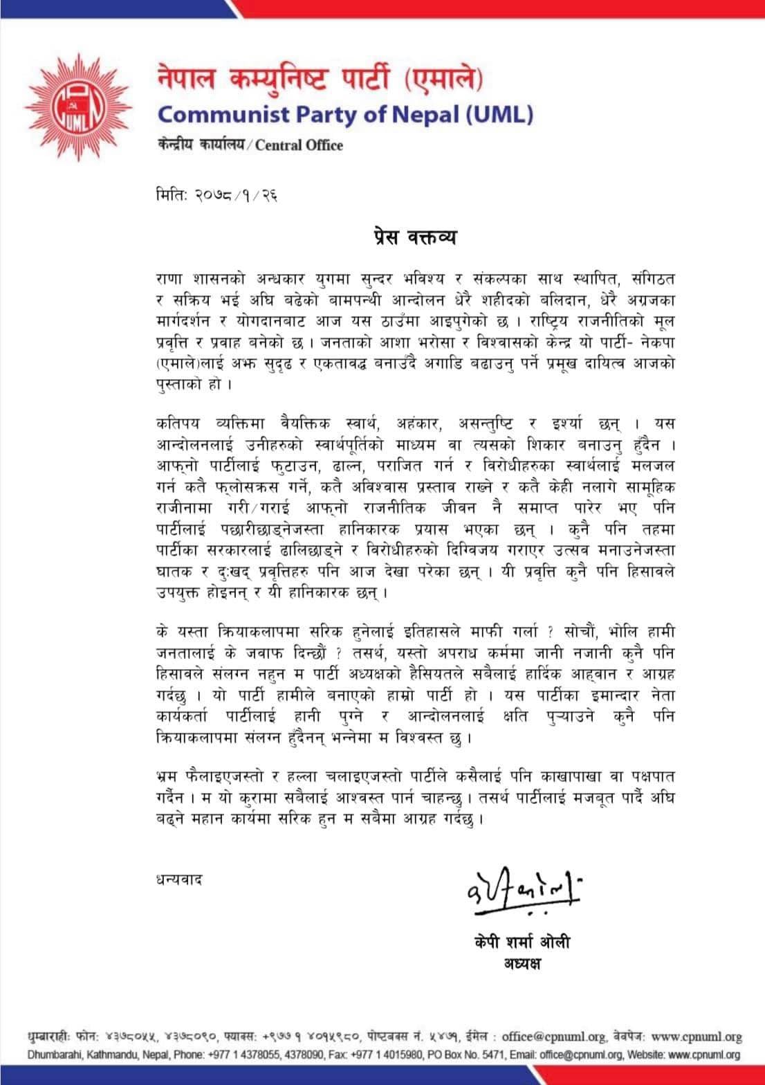 पार्टी अध्यक्षको हैसियतमा ओलीले त्यस्ता अपराध कर्ममा संलग्न नहुन सबैलाई आह्वान र आग्रह गर्नुभएको छ । पार्टी विभाजन रोक्न गरेको अन्तिम प्रयासस्वरुप ओलीले विज्ञप्तिमार्फत नेता कार्यकर्तालाई एकताबद्ध हुन आग्रह गर्नुभएको हो ।