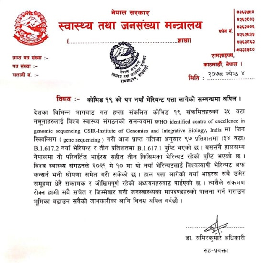 ‘भारतको ल्याबमा गरिएको जिन सिक्वेन्सिङको मंगलबार प्राप्त नजिताअनुसार ९७ प्रतिशत अर्थात ३४ वटा नमुनामा बी १.६१७.२ र तीन प्रतिशत अर्थात एउटा नमुनामा बी १.६१७.२ पुष्टि भएको छ’ मन्त्रालयका सहप्रवक्ता समिरकुमार अधिकारीद्धारा हस्ताक्षतिर अपिलमा भनिएको छ ।