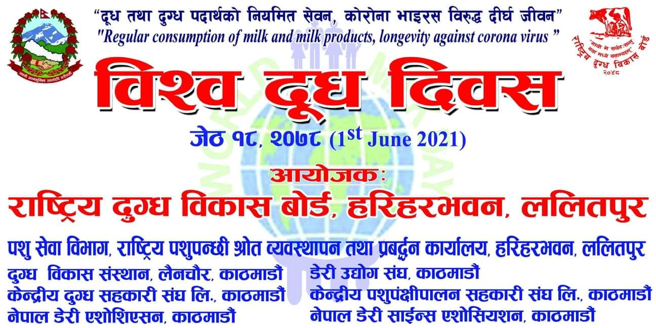 आज जुन १ तारिख अर्थात विश्व दूध दिवस दुग्ध क्षेत्रले सम्पूर्ण आर्थिक विकास, पोषण तथा खाद्य सुरक्षण एवं जिविकोपार्जनमा पुर्याएको महत्वपूर्ण योगदानको मनन गर्दै मनाइँदैछ । विश्वमा खाद्य तथा कृषि संगठन (एफएओ) ले जुन १, २००१ वाट विश्व दूध दिवस मनाउन शुरु गरेको हो । विश्वरभर विभिन्न कार्यक्रमको आयोजना गरी २१ औं अन्तराष्ट्रिय विश्व दूध दिवस मनाइँदैछ ।