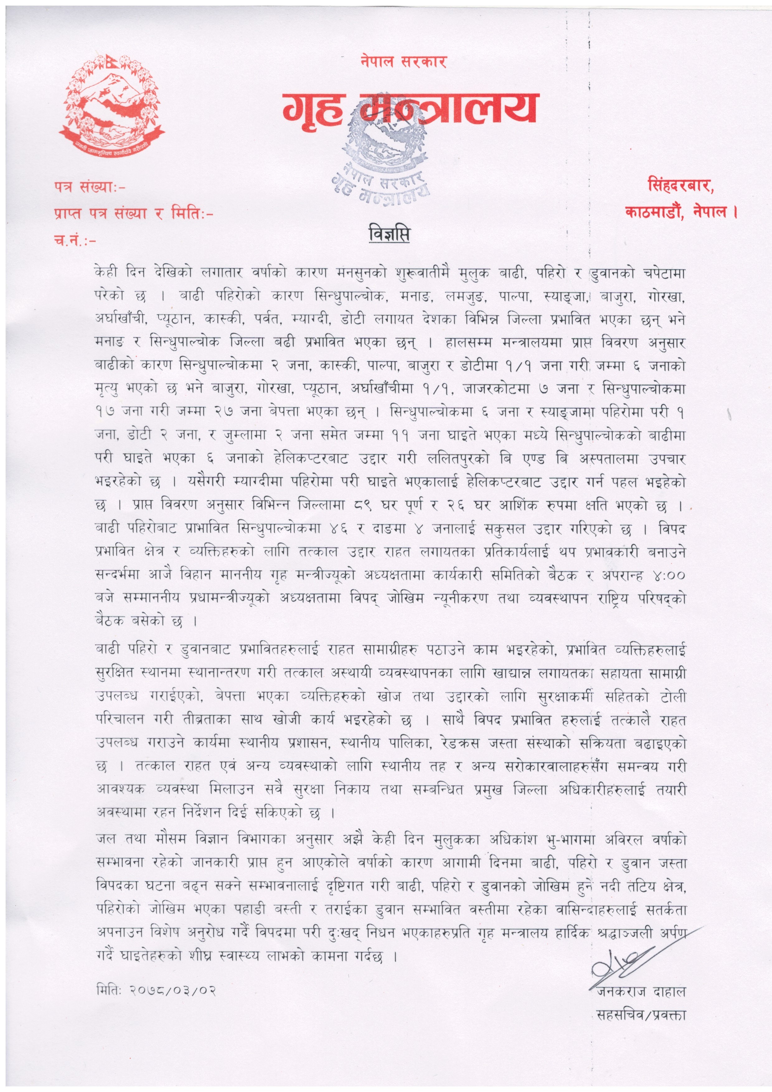 बाढी पहिरोबाट सिन्धुपाल्चोक, गोरखा, मनाङ, प्युठान, पाल्पा, स्याङ्जा, लमजुङ, अर्घाखाँची, कास्की, जुम्ला, जाजरकोट, डोटी र बाजुरा प्रभावित भएका गृहले जनाएको छ । अहिलेसम्म सिन्धुपाल्चोकमा २, कास्की, पाल्पा, बाजुरा र डोटीमा १/१ गरेर ६ जनाको ज्यान गएको गृह मन्त्रालयले पुष्टि गरेको हो । बाजुरा, गोर्खा, प्युठान र अर्घाखाँचीमा १/१, जाजरकोटमा ७ तथा सिन्धुपाल्चोकमा १७ गरी २८ जना वेपत्ता भएको विज्ञप्तिमा उल्लेख छ ।