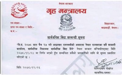 काठमाडौं – सरकारले राम नवमीको अवसरमा सार्वजनिक बिदा दिएको छ । बिहीबार बसेको मन्त्रिपरिषद्को बैठकको निर्णय अनुसार शनिबार गृह मन्त्रालयले विज्ञप्ति जारी गर्दै सार्वजनिक बिदा घोषणा गरेको हो ।