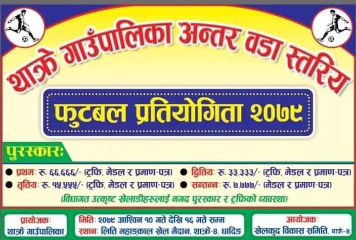 धादिङको थाक्रे गाउँपालिका खेलकुद समिति वडा नम्बर ४ ले आयोजना गर्ने उक्त फुटबल प्रतियोगिता असोज १० गते देखि १६ गते सम्म लिति महाङ्काल  खेल मैदानमा संचालन हुनेछ ।