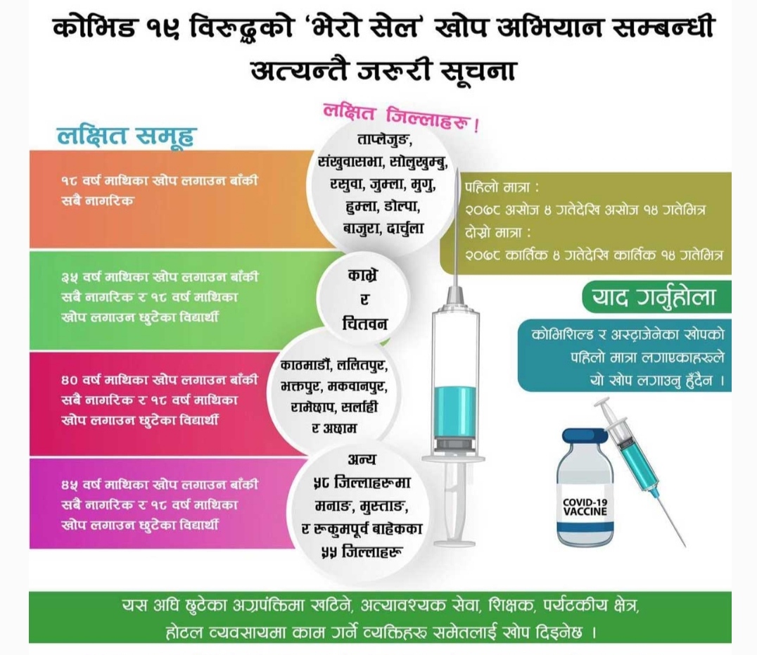 स्वास्थ्य सेवा विभाग परिवार कल्याण महाशाखा अन्तर्गत् खोप शाखा अनुसार रसुवा, ताप्लेजुङ, संखुवासभा, सोलुखुम्बु,जुम्ला, मुगु, हुम्ला, डोल्ला, बाजुरा र दार्चुलामा १८ वर्षमाथिका खोप लगाउन छुटेका सबै नागरिकलाई खोप दिइनेछ।